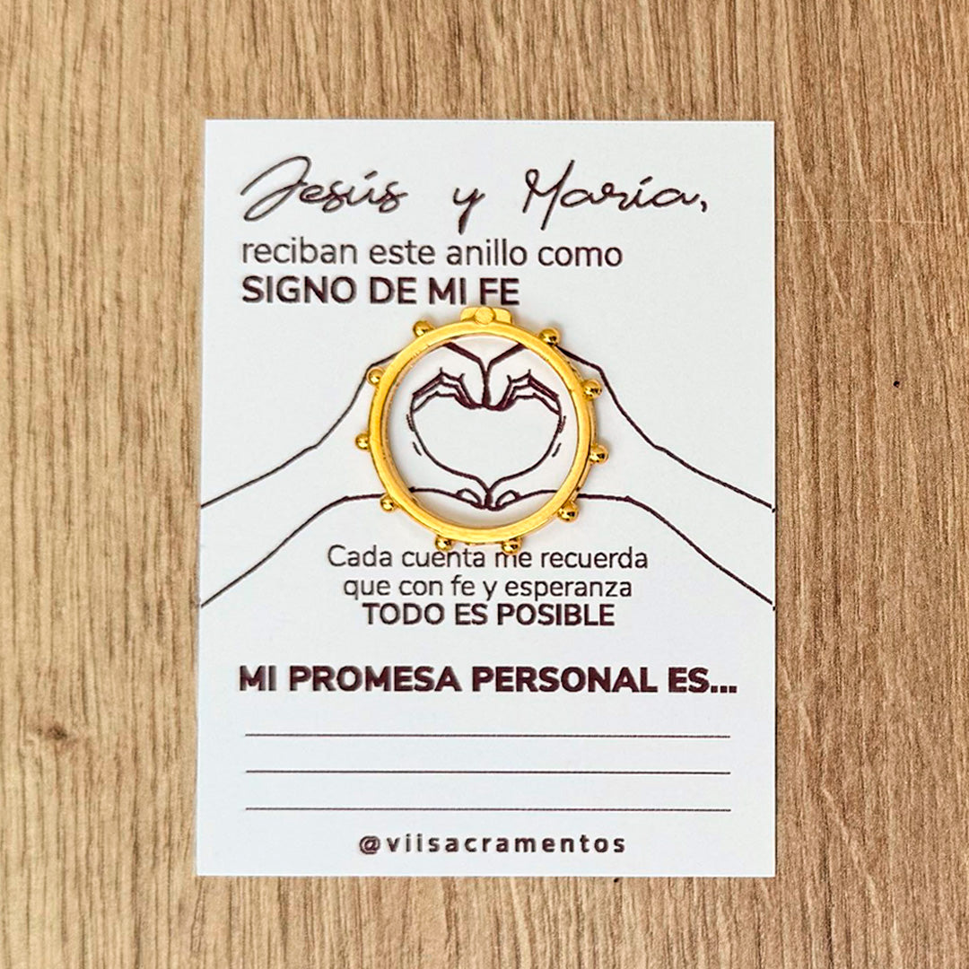 El anillo viene acompañado de una tarjeta de promesa (5.5 x 7.5 cm), que invita a realizar un compromiso personal de fe. Cada cuenta del anillo recuerda que, con fe y esperanza, todo es posible.