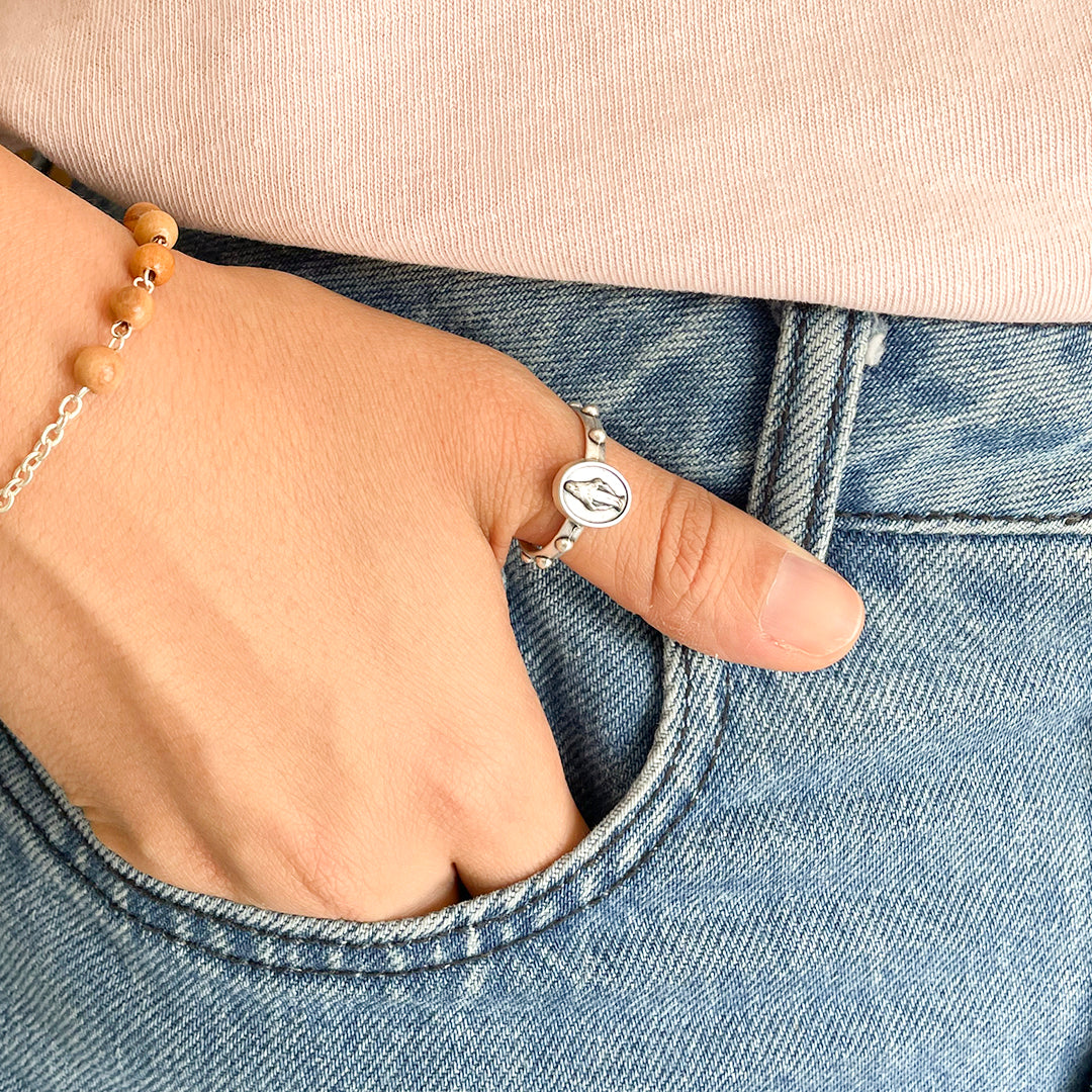 Este anillo italiano, diseñado como una decena del rosario, está hecho de alpaca italiana con un acabado plateado. En el centro del anillo se encuentra la medalla de la Virgen Milagrosa, lo que lo convierte en un accesorio ideal para aquellos que disfrutan o tienen el hábito de rezar el rosario. Además, este anillo sirve como un símbolo de protección y compañía de la Virgen María.