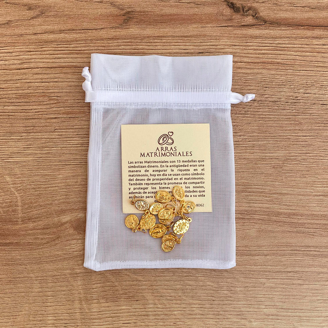 Celebra la abundancia y el compromiso en tu matrimonio con nuestras Arras Matrimoniales, compuestas por trece medallas, cada una con un significado especial. Doce de las medallas simbolizan los bienes de la pareja para cada uno de los meses del año, y la decimotercera está destinada a ser compartida con los más necesitados, reflejando un gesto de caridad y amor.