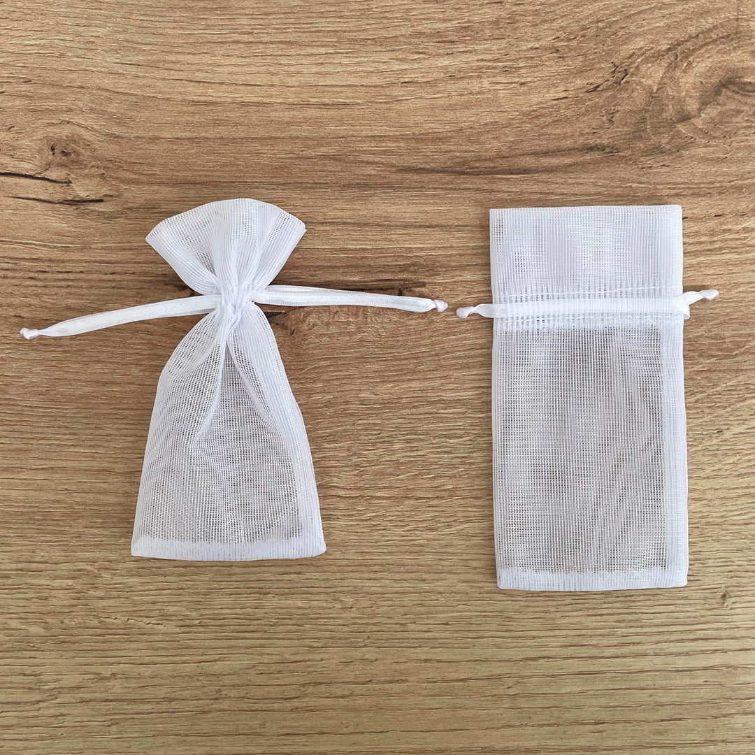 Esta bolsa de tela, confeccionada por VII Sacramentos en muselina blanca, es una pieza versátil y encantadora. Con dimensiones de 11.5 cm de alto x 6 cm de ancho, es perfecta para guardar un rosario, empacar una vela, o cualquier otro detalle o regalo especial. Además, puede ser utilizada para guardar almendras, chocolates, accesorios y ofrecer como souvenir.