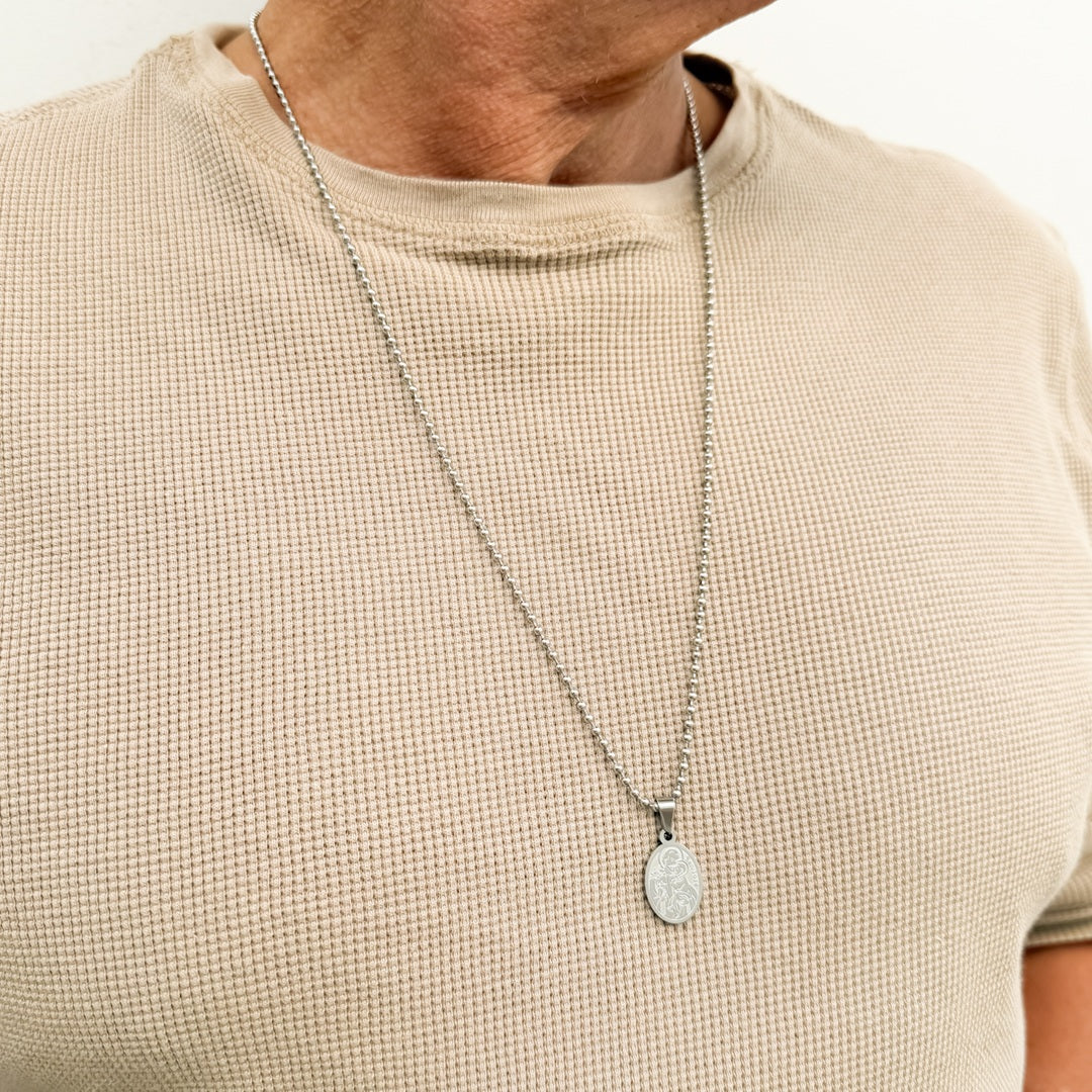 Esta cadena elaborada en acero plateado de alta calidad es un accesorio pensado para quienes buscan llevar consigo la protección y ternura de San José, patrono de las familias y ejemplo de fortaleza espiritual. Con un largo total de 68 cm, se adapta cómodamente al pecho, brindando una apariencia moderna, masculina y significativa.
