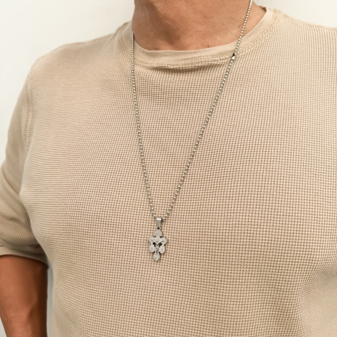 Esta cadena estilo militar, elaborada en acero plateado de alta resistencia, es un accesorio moderno y significativo para quienes desean llevar un símbolo profundo de fe y reconciliación. Mide 68 cm de largo, lo que permite que caiga con comodidad sobre el pecho y combine fácilmente con cualquier estilo.