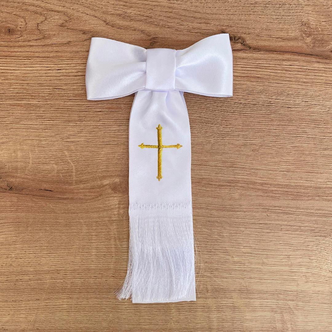 Con unas dimensiones de 17 cm de largo y 6,1 cm de ancho, este lazo no solo es una obra de arte, sino que también simboliza la pureza y la devoción que acompañan este momento sagrado. Hecho a mano con esmero y amor, cada pieza es única y especial. Utilizando una cinta de raso de alta calidad, garantizamos que este adorno perdurará como un recuerdo preciado de esta celebración trascendental.