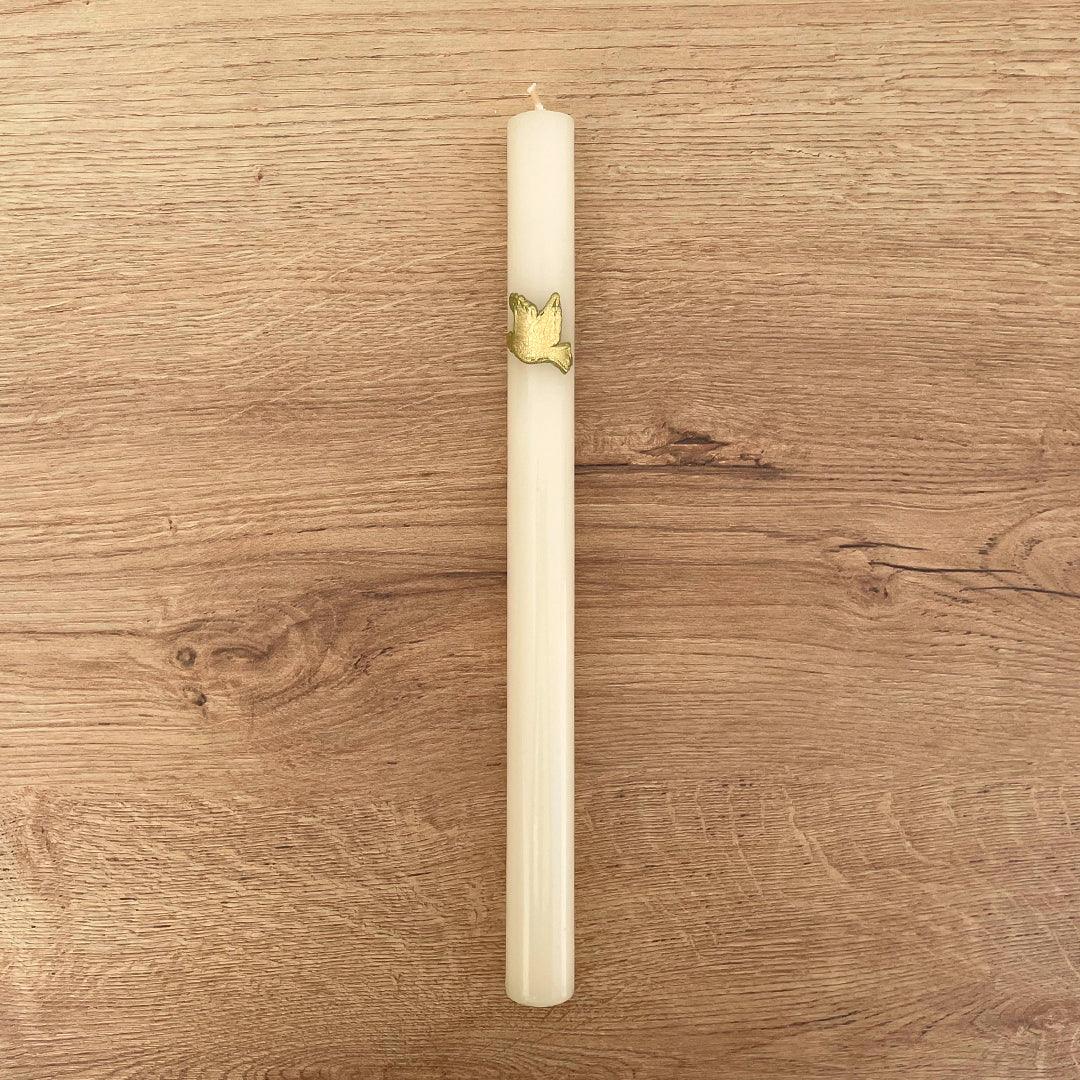 El Cirio con Aplique Dorado de la Paloma del Espíritu Santo es una vela ceremonial de 30 cm de altura, concebida para ser usada en momentos litúrgicos significativos como el Bautizo o la Primera Comunión.