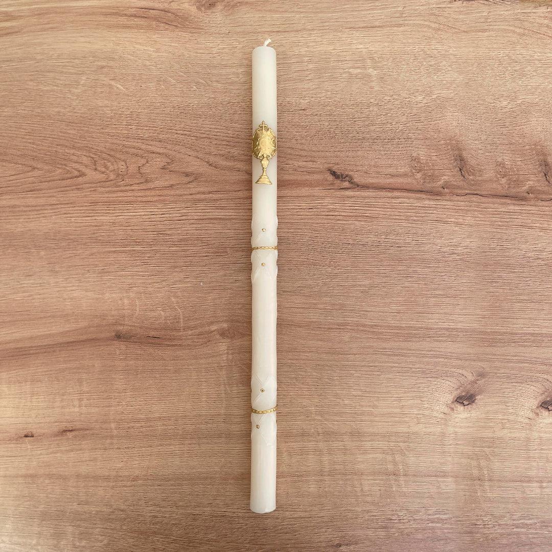 El Cirio o vela con Aplique Dorado de la Custodia o Copón para Hostias es una vela ceremonial de 42 cm de altura, especialmente diseñada para ser utilizada en ceremonias importantes como el Bautizo o la Primera Comunión.