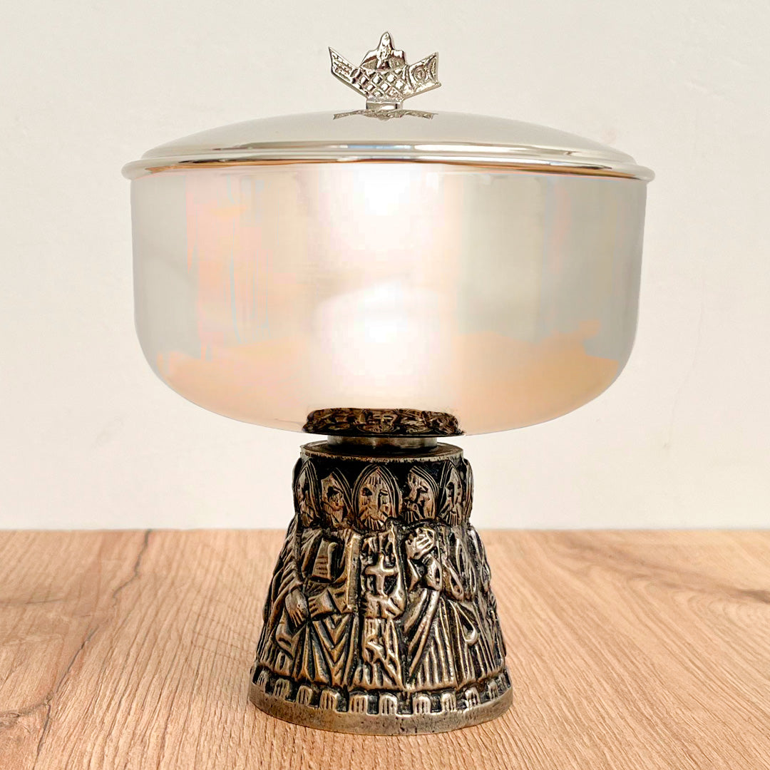 Este copón litúrgico es un recipiente sagrado diseñado para guardar hostias consagradas con solemnidad. Su diseño exclusivo incluye una base decorada con una representación en 360° de la escena de la Última Cena, simbolizando el sacrificio de Cristo y el significado de la Eucaristía. Es compatible con otros artículos litúrgicos específicos, como el cáliz (art. 32-752), el cuenco para hostias (art. 32-754) y el estuche de almacenamiento (art. 10-451).