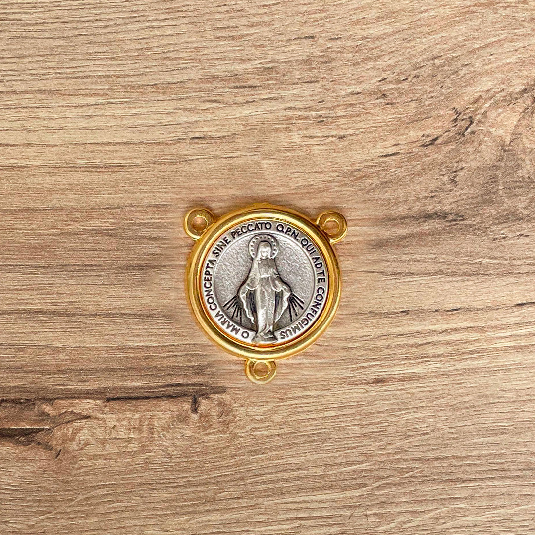 Eleva tu rosario con nuestro hermoso Crucero Virgen Milagrosa Italiano, elaborado en zamak con un elegante baño en oro. Con un diámetro de 2.2 cm, esta medalla bicolor es perfecta para ser utilizada en la confección de rosarios, situándose en la mitad del mismo y añadiendo un toque de distinción y espiritualidad.