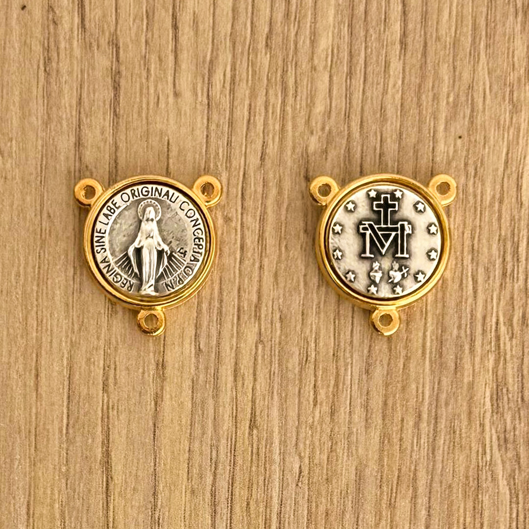 Eleva tu rosario con nuestro hermoso Crucero Virgen Milagrosa Italiano, elaborado en zamak con un elegante baño en oro. Con un diámetro de 1.5 cm, esta medalla bicolor es perfecta para ser utilizada en la confección de rosarios, situándose en la mitad del mismo y añadiendo un toque de distinción y espiritualidad.