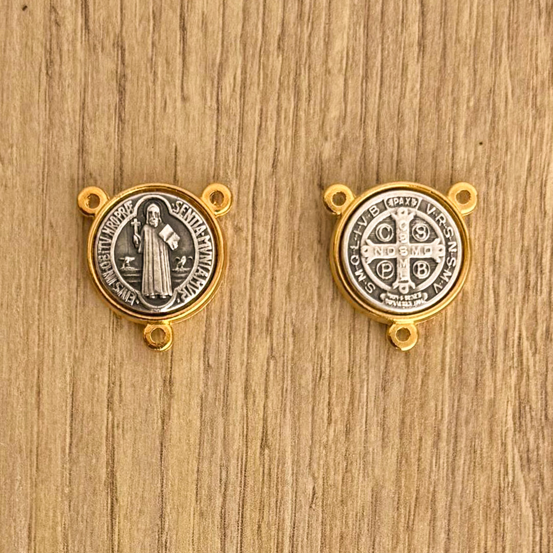 Eleva tu rosario con nuestro hermoso Crucero Medalla de San Benito Italiano, elaborado en zamak con un elegante baño en oro. Con un diámetro de 1.5 cm, esta medalla bicolor es perfecta para ser utilizada en la confección de rosarios, situándose en la mitad del mismo y añadiendo un toque de distinción y espiritualidad.