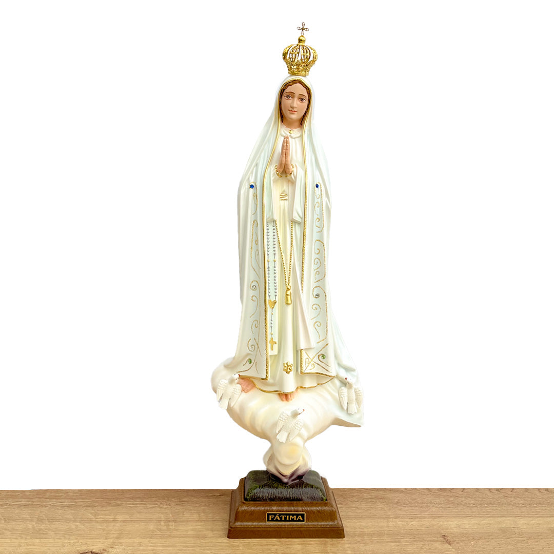 Esta estatua de 50 cm (19.6”), incluyendo la corona, es una representación sublime de Nuestra Señora de Fátima, inspirada en la imagen venerada en el Santuario de Fátima en Portugal. Su manto, pintado a mano en un tono blanco puro, resalta la pureza y serenidad de la Virgen María, mientras que sus ojos de vidrio añaden un toque de realismo y profundidad a su expresión.