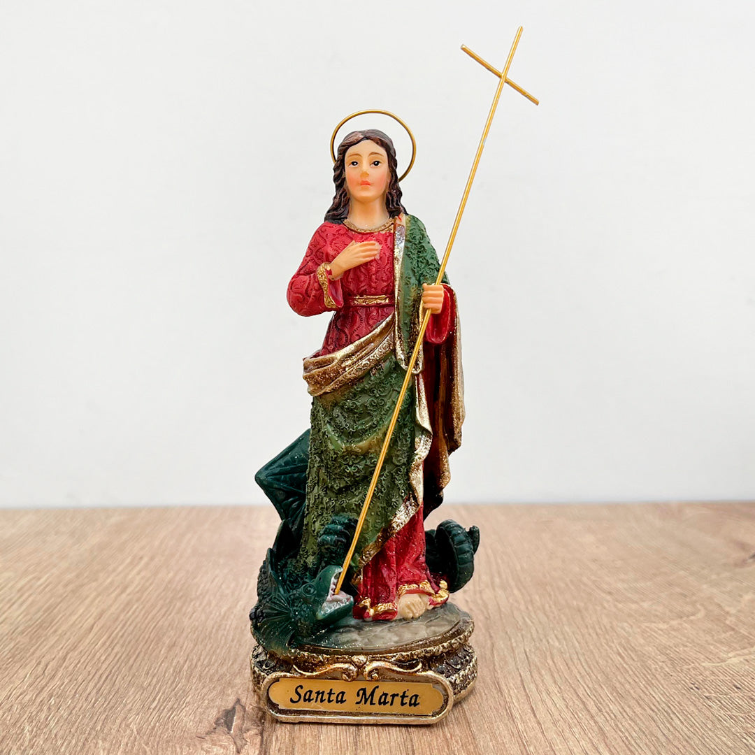 Esta estatua es una invitación a encomendarte a Santa Marta y a confiar en su poderosa intercesión, incluso en las situaciones más difíciles y desesperadas. Elaborada con meticulosidad en resina italiana de alta calidad, esta imagen asegura durabilidad y belleza perdurable en tu hogar.