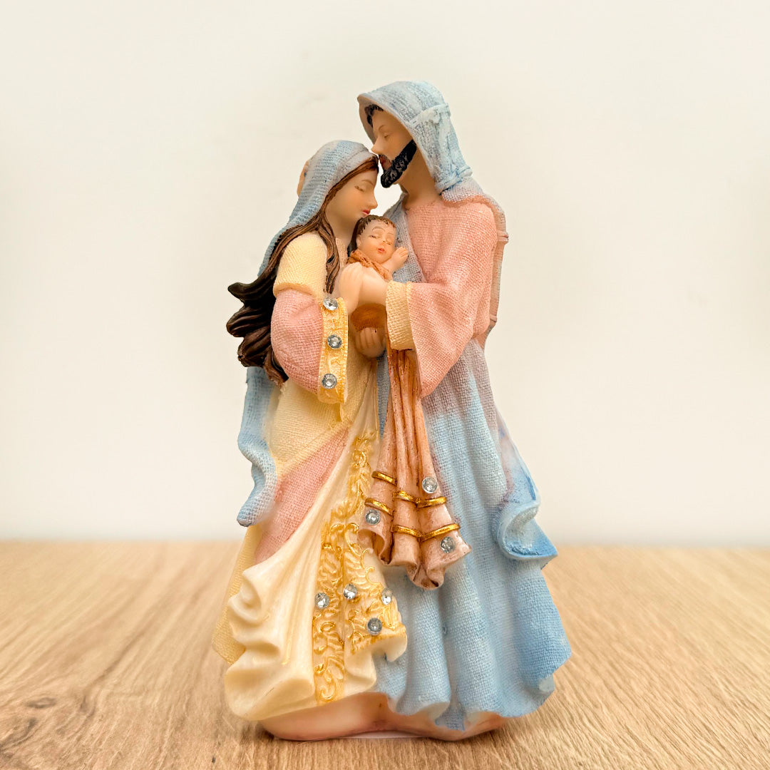 Cada detalle está cuidadosamente trabajado en resina italiana, con delicados acabados y aplicaciones brillantes que realzan la textura de los mantos y la serenidad de los rostros. Su tamaño compacto la convierte en una pieza ideal para colocar en altares, repisas o mesas auxiliares, donde inspire devoción y armonía.