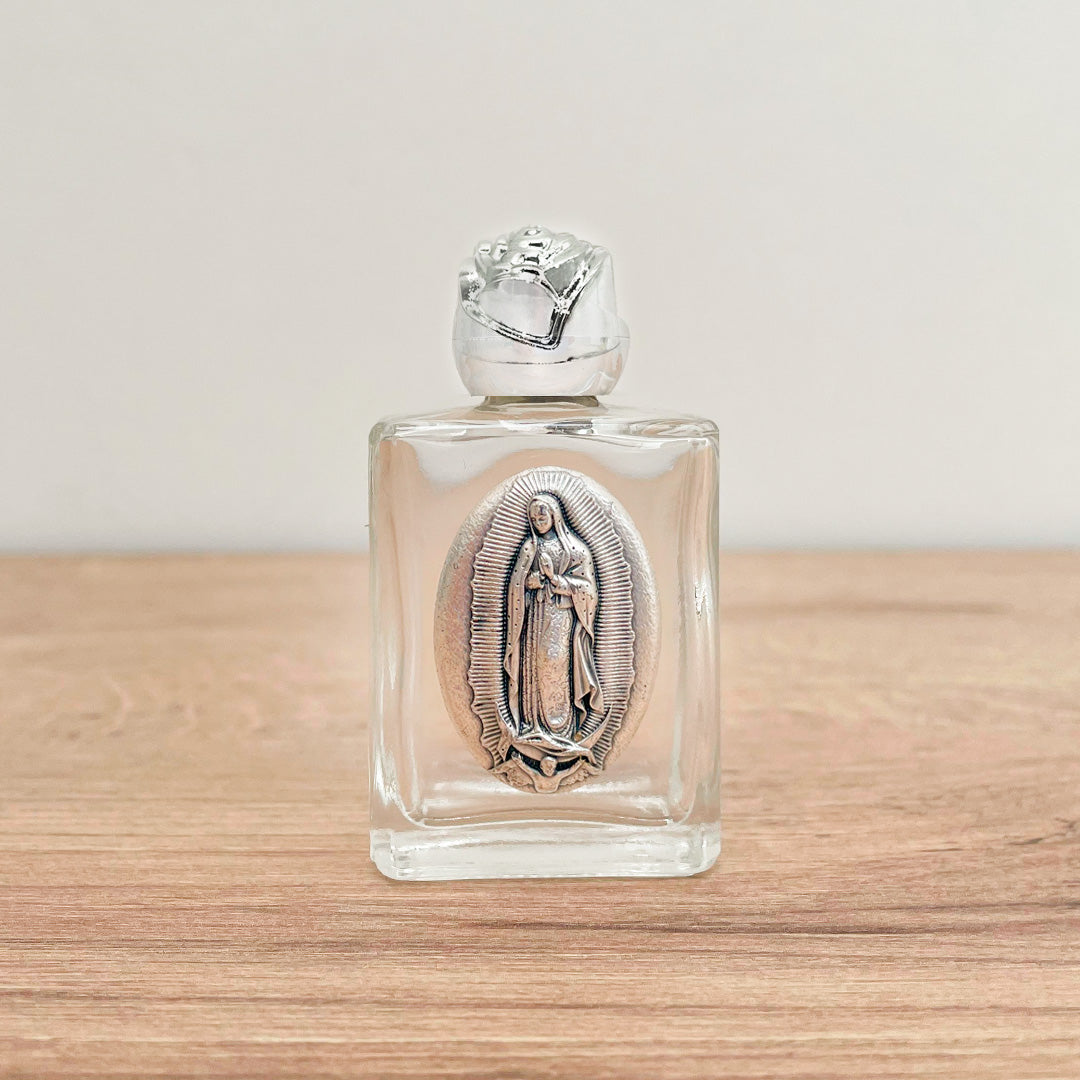 Este elegante frasco de vidrio es ideal para guardar agua bendita o cualquier otro sacramental, como aceite y sal. Con una imagen tipo aplique en alpaca italiana que presenta la medalla de la Virgen de Guadalupe Cuerpo Completo, este frasco combina funcionalidad con un toque de espiritualidad y protección.