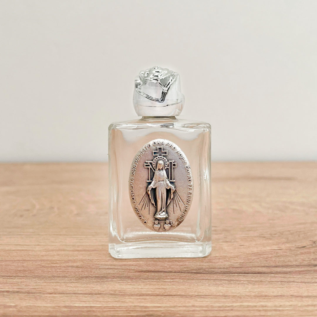 Este elegante frasco de vidrio es ideal para guardar agua bendita o cualquier otro sacramental, como aceite y sal. Con una imagen tipo aplique en alpaca italiana que presenta la medalla de la Virgen Milagrosa, este frasco combina funcionalidad con un toque de espiritualidad y protección.
