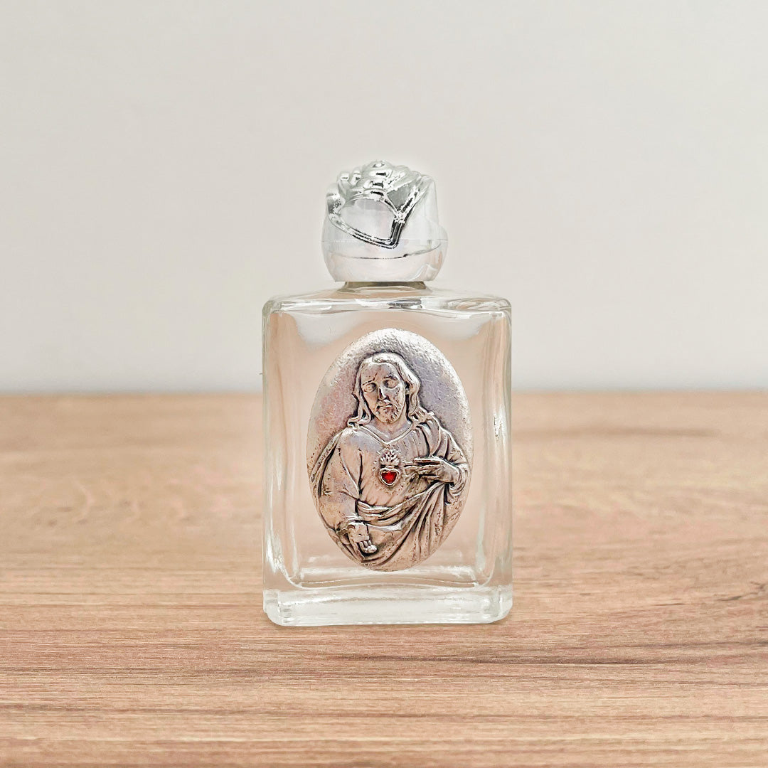 Este elegante frasco de vidrio es ideal para guardar agua bendita o cualquier otro sacramental, como aceite y sal. Con una imagen tipo aplique en alpaca italiana que presenta la medalla del Sagrado Corazón de Jesús, este frasco combina funcionalidad con un toque de espiritualidad y protección.