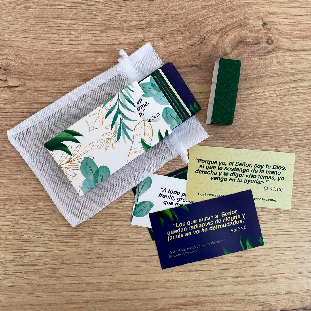 Uso: El Kit 40 Promesas es ideal para fortalecer tu fe y confianza en Dios diariamente. Cada tarjeta ofrece una promesa divina acompañada de una actividad práctica, proporcionando una manera tangible de reflexionar y actuar sobre las palabras sagradas. Además, el espacio en la parte posterior de cada tarjeta permite personalizar los mensajes, lo que hace de este kit un regalo significativo y espiritual para tus seres queridos.
