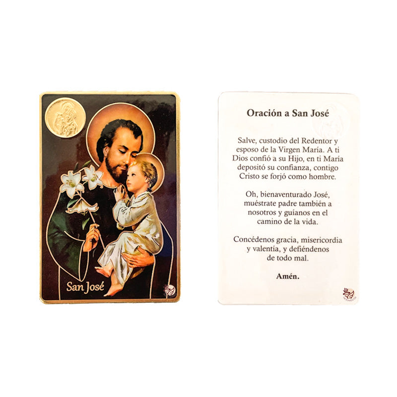 La lámina credencial de San José está hecha en Colombia, diseñada para ser un símbolo tangible de protección y fe. Esta lámina presenta una imagen detallada de San José con una medalla en forma de aplique plastificado dorado.