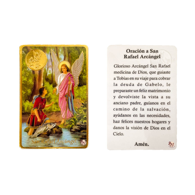 La lámina credencial de San Rafael Arcángel está hecha en Colombia, diseñada para ser un símbolo tangible de protección y fe. Esta lámina presenta una imagen detallada de San Rafael Arcángel con una medalla en forma de aplique plastificado dorado.