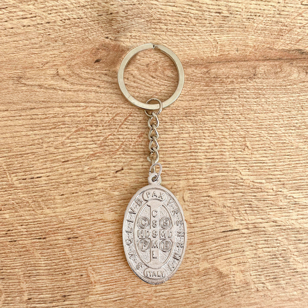 Este elegante llavero con medalla de San Benito ovalada es un obsequio significativo que simboliza protección y devoción. La medalla, importada de Italia, está hecha de zamak con un baño en niquel, y tiene una medida de 4.5cm de alto por 2cm de ancho. El llavero cuenta con un herraje de 3 cm de diámetro, lo que lo hace perfecto para llevar a cualquier parte.