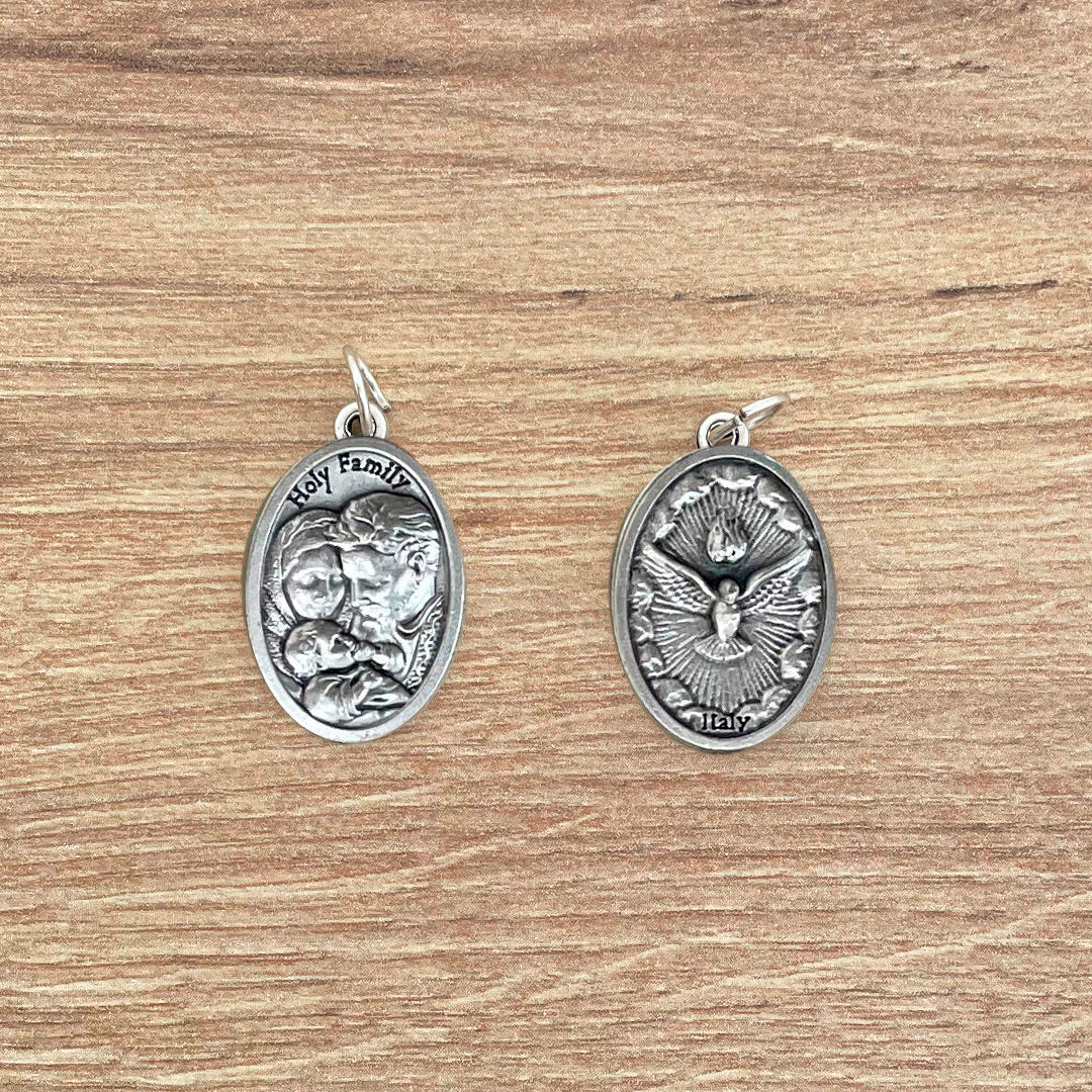 Refuerza tu fe con nuestra elegante Medalla Italiana de la Sagrada Familia y el Espíritu Santo, elaborada principalmente en alpaca italiana, su diseño es ovalado de 2.5cm de alto x 1.5cm de ancho.
