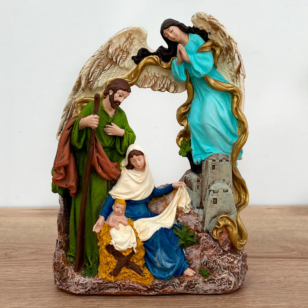 Este bello pesebre de 21 cm de alto, 15 cm de ancho y 5 cm de espesor parece tallado a mano, destacando la escena principal del nacimiento de Jesús. Su diseño único presenta un ángel sobre la ciudad de Belén, simbolizando la protección divina sobre la Sagrada Familia. Cada detalle ha sido cuidadosamente trabajado para crear una pieza singular que evocará la espiritualidad de la Navidad en cualquier hogar.