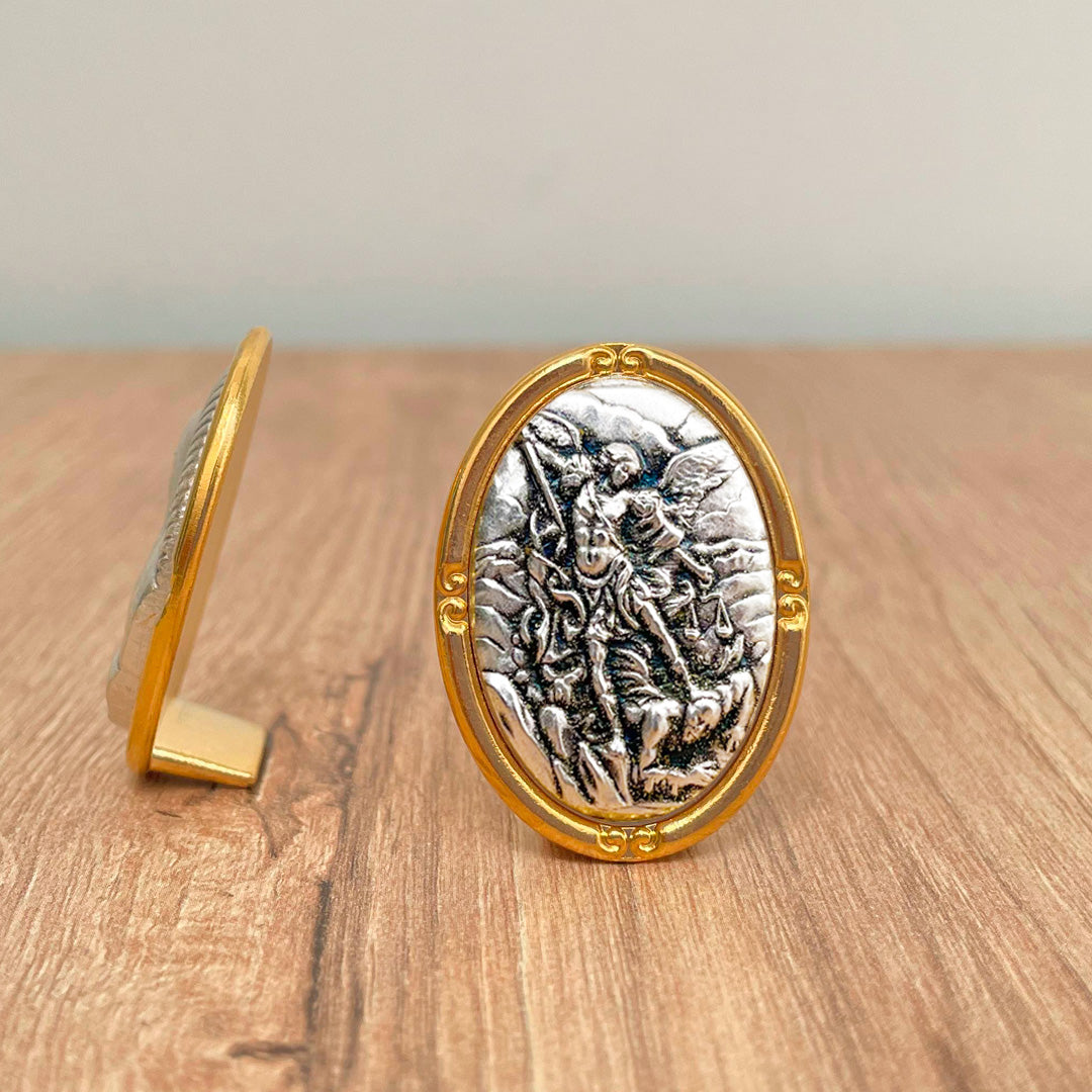 Aporta un toque de espiritualidad y protección a tu hogar con este exquisito oratorio de San Miguel Arcángel. Hecho en alpaca italiana con baño en oro, esta imagen decorativa religiosa combina belleza y devoción en un diseño único.