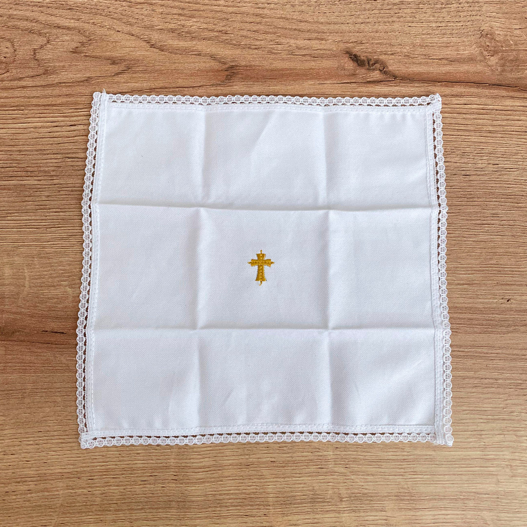 Este paño purificador, con dimensiones de 9.5 cm x 9.5 cm, es un accesorio esencial en ceremonias religiosas. Es utilizado durante la comunión para recibir la hostia de manera reverente o para secar la cabeza del bebé en el bautismo, simbolizando pureza y devoción.