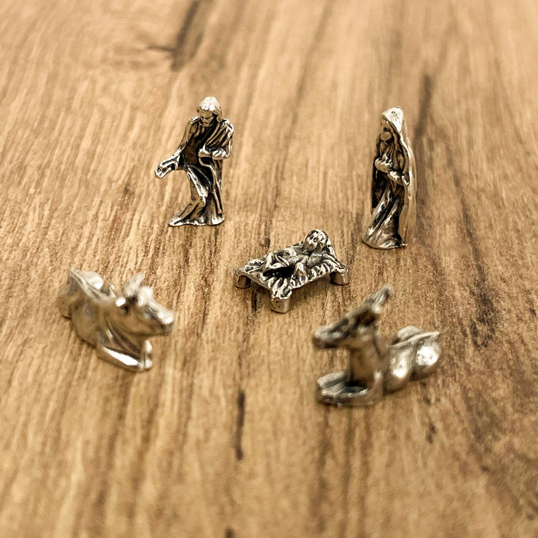 Este hermoso pesebre italiano está elaborado en alpaca y consta de 5 piezas, cada una con una altura de 1.5 cm. Esta representación detallada captura la escena del nacimiento de Jesús en el pesebre, en compañía de María y José, convirtiéndose en un símbolo de fe y devoción perfecto para tu hogar durante la Navidad.