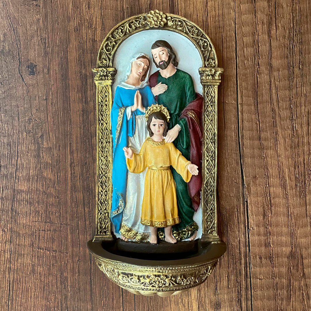 La Pila para Agua Bendita de la Sagrada Familia es una hermosa y significativa pieza de arte religiosa, diseñada para colgar en la pared y servir como contenedor de agua bendita. Esta pila está hecha en resina y pintada a mano con gran detalle, presentando la imagen de la Sagrada Familia, simbolizando unión, amor y protección.