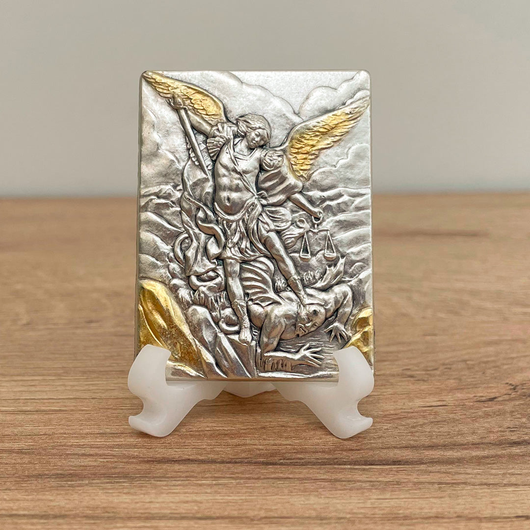 Enaltece tu espacio de oración con nuestra imponente placa aplique tipo oratorio, que presenta la poderosa imagen de San Miguel Arcángel. Este aplique decorativo, finamente trabajado en alpaca italiana, captura la esencia del arcángel guerrero, protector y defensor contra el mal.