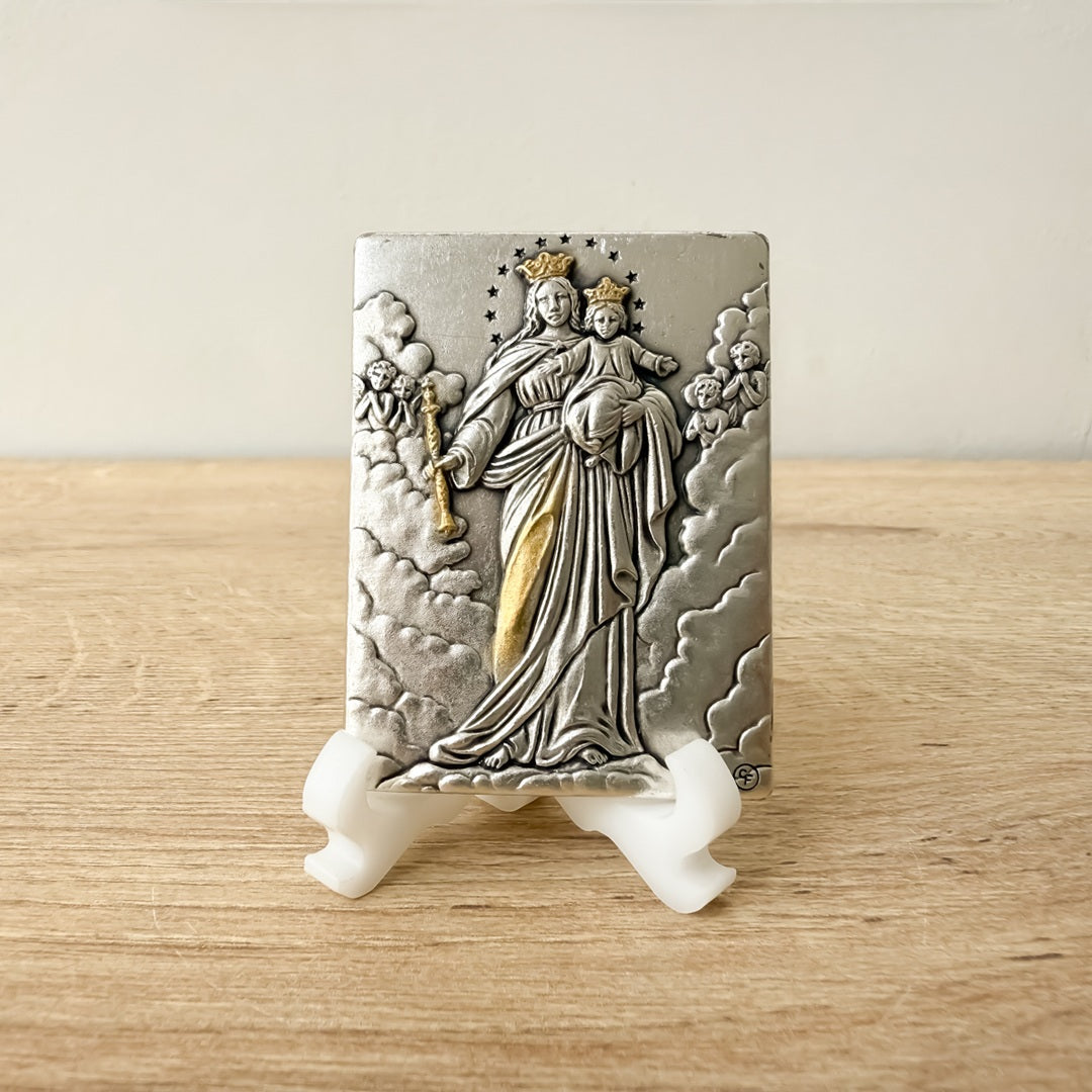 Lleva la protección y ternura maternal de la Virgen María Auxiliadora a tu hogar con nuestra placa aplique tipo oratorio. Esta pieza devocional, elaborada en alpaca italiana, refleja la cercanía y auxilio de María para quienes acuden a Ella con fe.