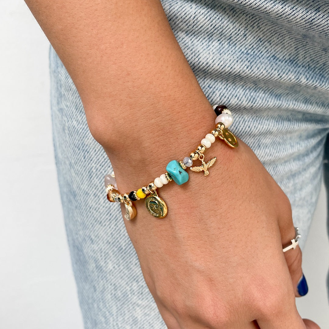 Pulsera ajustable está elaborada con hilo y cuenta con seis medallas bañadas en oro, complementadas con piedras naturales. Cada medalla y piedra tiene su propio significado y juntas van contando la oración del Ángel de la Guarda.