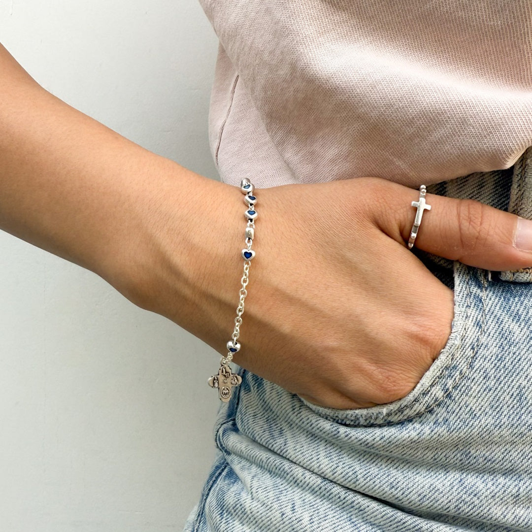 Esta delicada pulsera denario está elaborada con una fina cadena de alpaca italiana y decorada con cuentas en forma de corazón. Cada cuenta y el Padre Nuestro presentan un diseño especial con el centro resinado en color azul. En un extremo, la pulsera cuenta con una Cruz de las Siete Gracias de 1,5 cm x 1,2 cm (0,59" x 0,47").