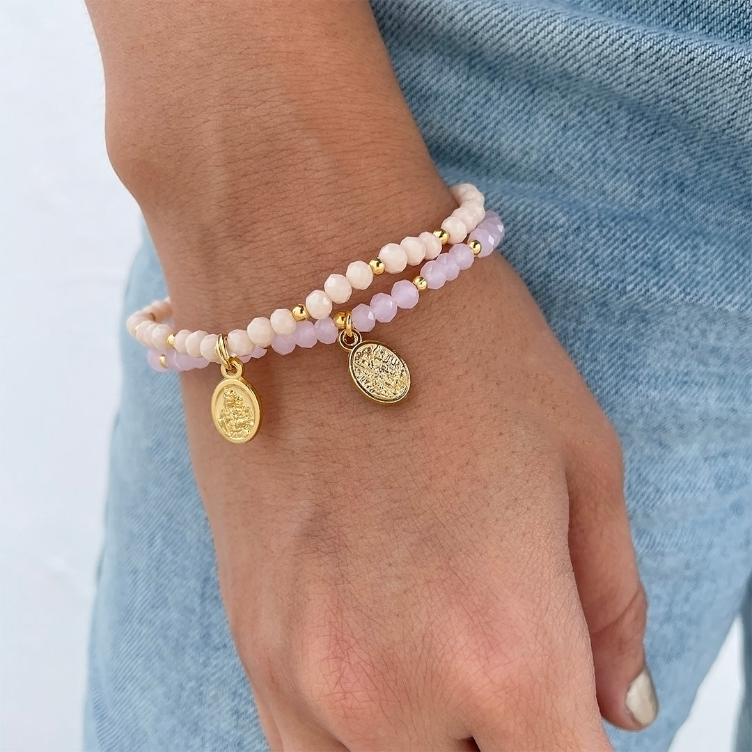 Pulsera elástica con muranos de 3 mm de diámetro, intercalados con balines bañados en oro. La pulsera incluye una medalla italiana de 1 cm de largo con motivos de la Virgen. Disponible en dos colores: rosado y beige.