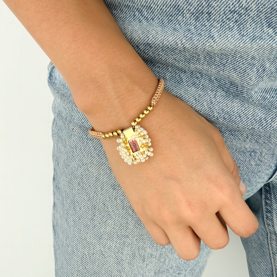 Pulsera elaborada en hilo beige con un diseño artesanal lleno de devoción y simbolismo. En el centro resalta un escapulario bordado en tonos beige y dorado, de 2 cm x 1,5 cm, cuidadosamente rebordado con mostacilla que le otorga brillo y detalle. A cada lado lo acompañan 5 balines de acero, que aportan un contraste elegante al tejido de 4,5 cm de largo. Su medida total es de 13 cm, logrando un diseño delicado y cómodo de llevar.