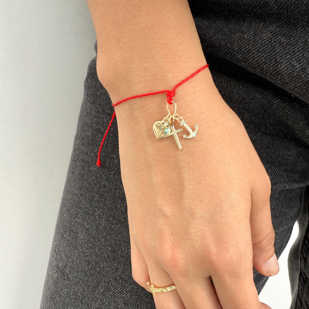Delicada pulsera de hilo rojo ajustable, diseñada para recordarte los valores esenciales de la vida. En el centro, lleva tres dijes de 1 cm (0,39") cada uno, con un profundo significado espiritual: