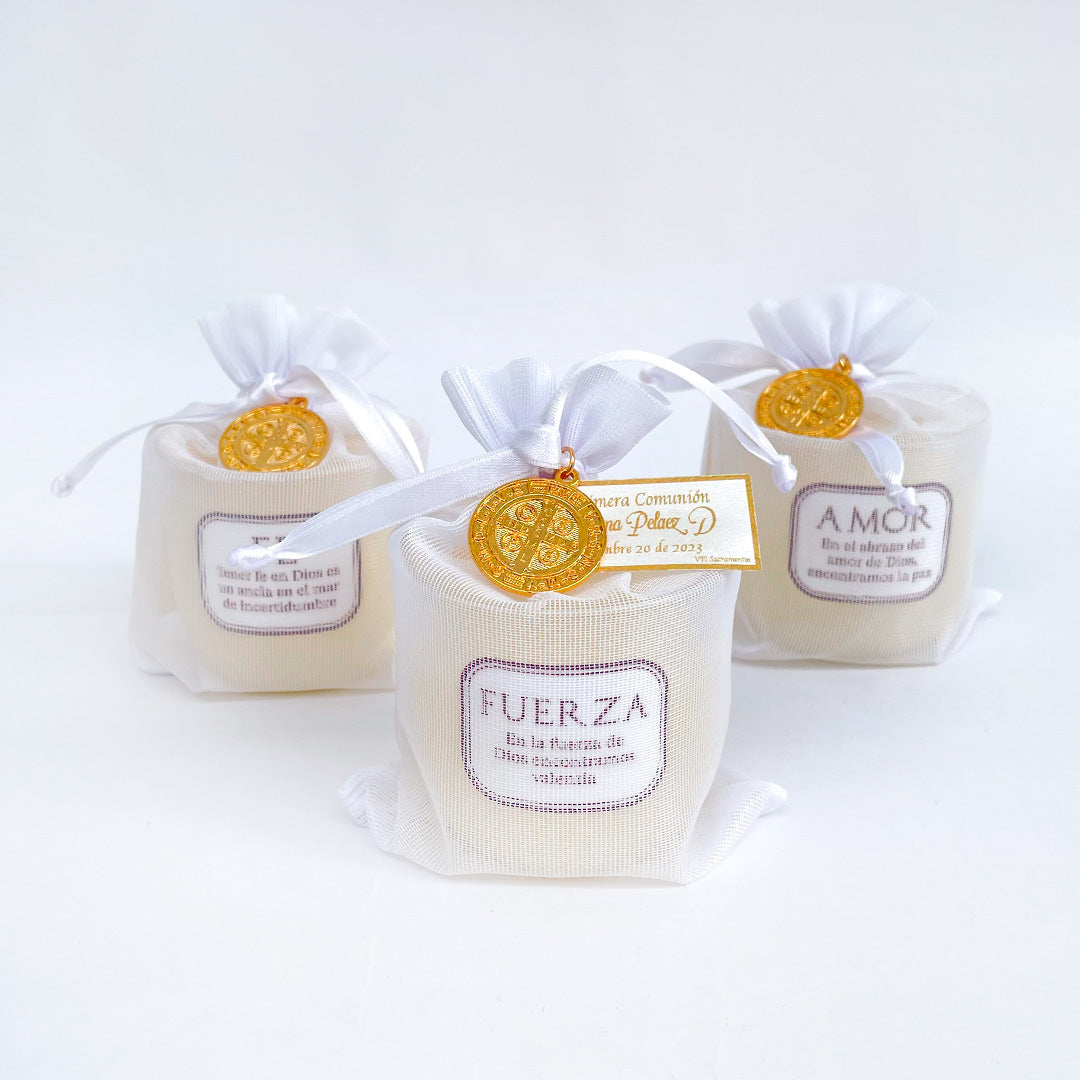 Este Kit de vela aroma con mensajes de Fe, Fuerza y Amor a Dios es un recordatorio espiritual que inspira y reconforta. Incluye una vela con un aroma agradable, acompañada de una medalla de San Benito en alpaca italiana con baño de oro.