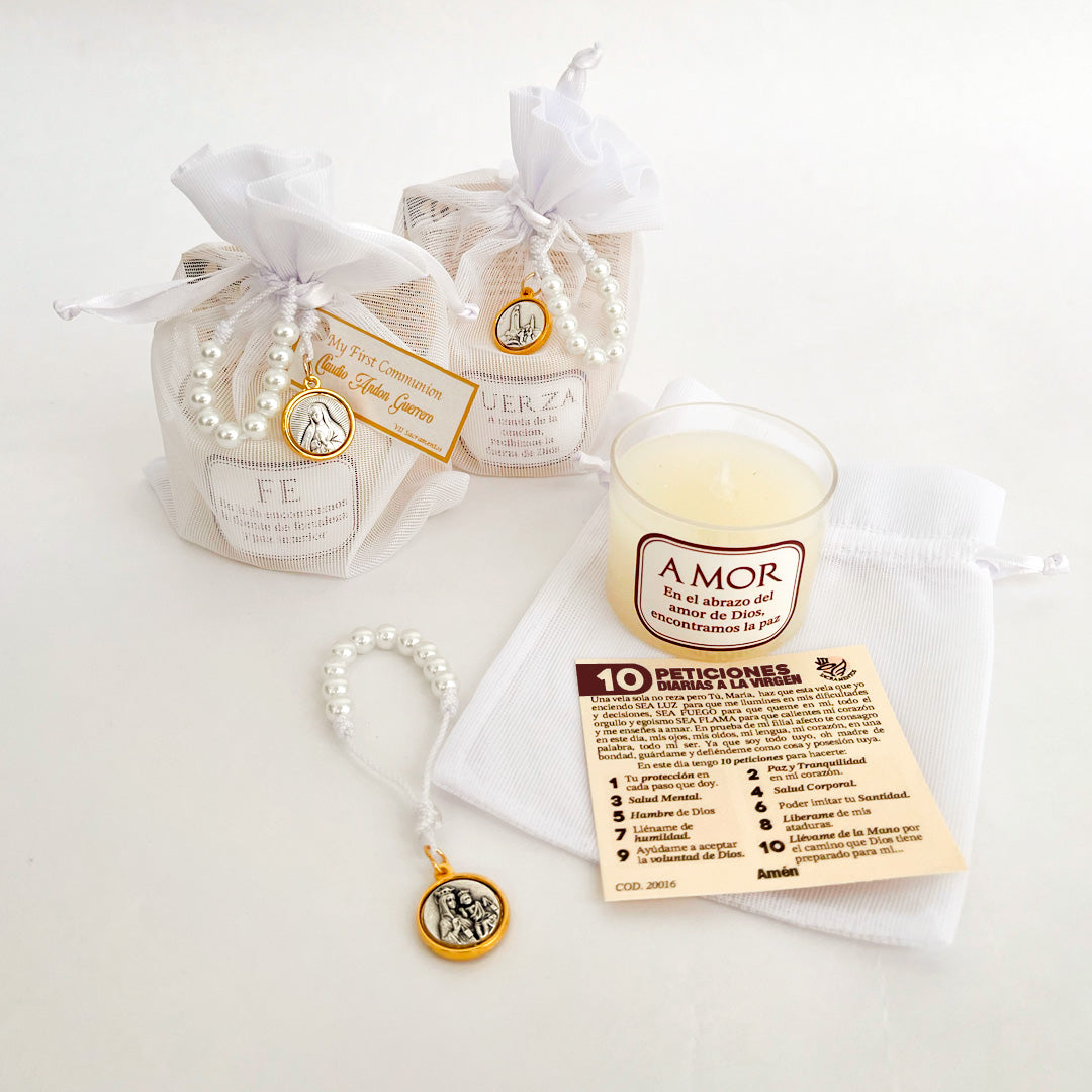 Ideal como souvenir para eventos como bautizos, primera comunión, misas y momentos de devoción personal, el Kit Vela Peticiones a la Virgen es un regalo significativo que fortalece la conexión espiritual con la Virgen María y promueve la fe y la contemplación.