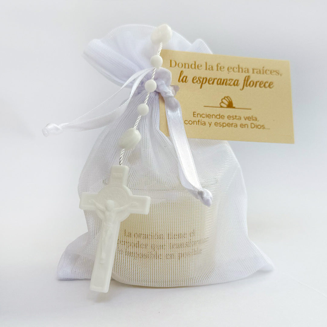 Incluye una vela aromática con un mensaje espiritual de Fe, junto a un rosario completo y una oración guía. Todo viene empacado cuidadosamente en una bolsa de tela, acompañado de una tarjeta personalizada, lo que lo convierte en un detalle bello y lleno de significado.