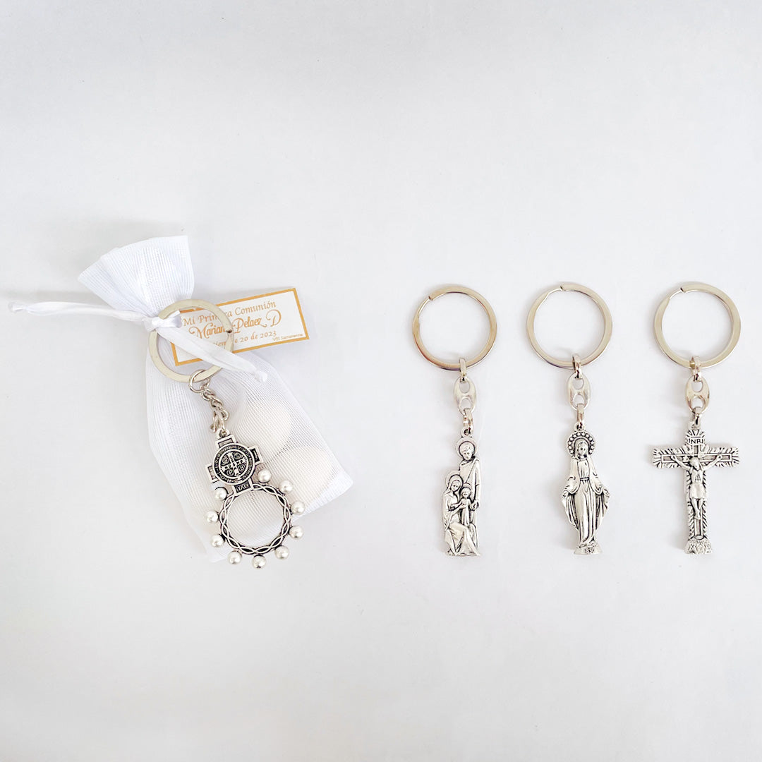 El llavero con Imagenes Surtidas. Con Imagenes religiosas, es ideal para eventos especiales como bautizos y primera comunión. Viene en una bolsa de tela blanca que incluye 3 almendras y una tarjeta personalizada. Pedidos deben hacerse con al menos 8 días de anticipación y considerar 3 días adicionales para envíos nacionales fuera de Barranquilla.