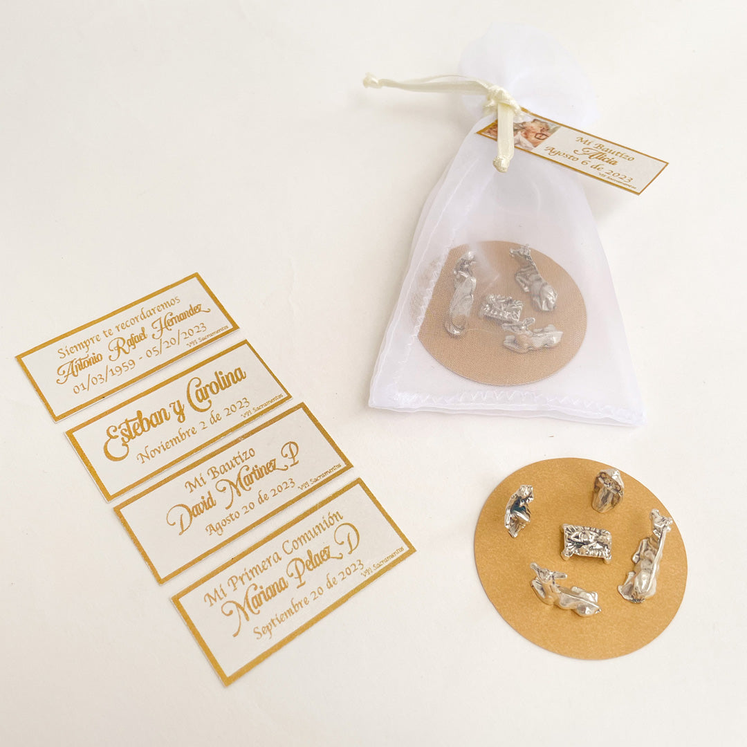 Viene empacado en una bolsa de tela blanca, con una base en carton dorado y una tarjeta personalizada. La información de la tarjeta se solicitará al cliente tras realizar el pedido.