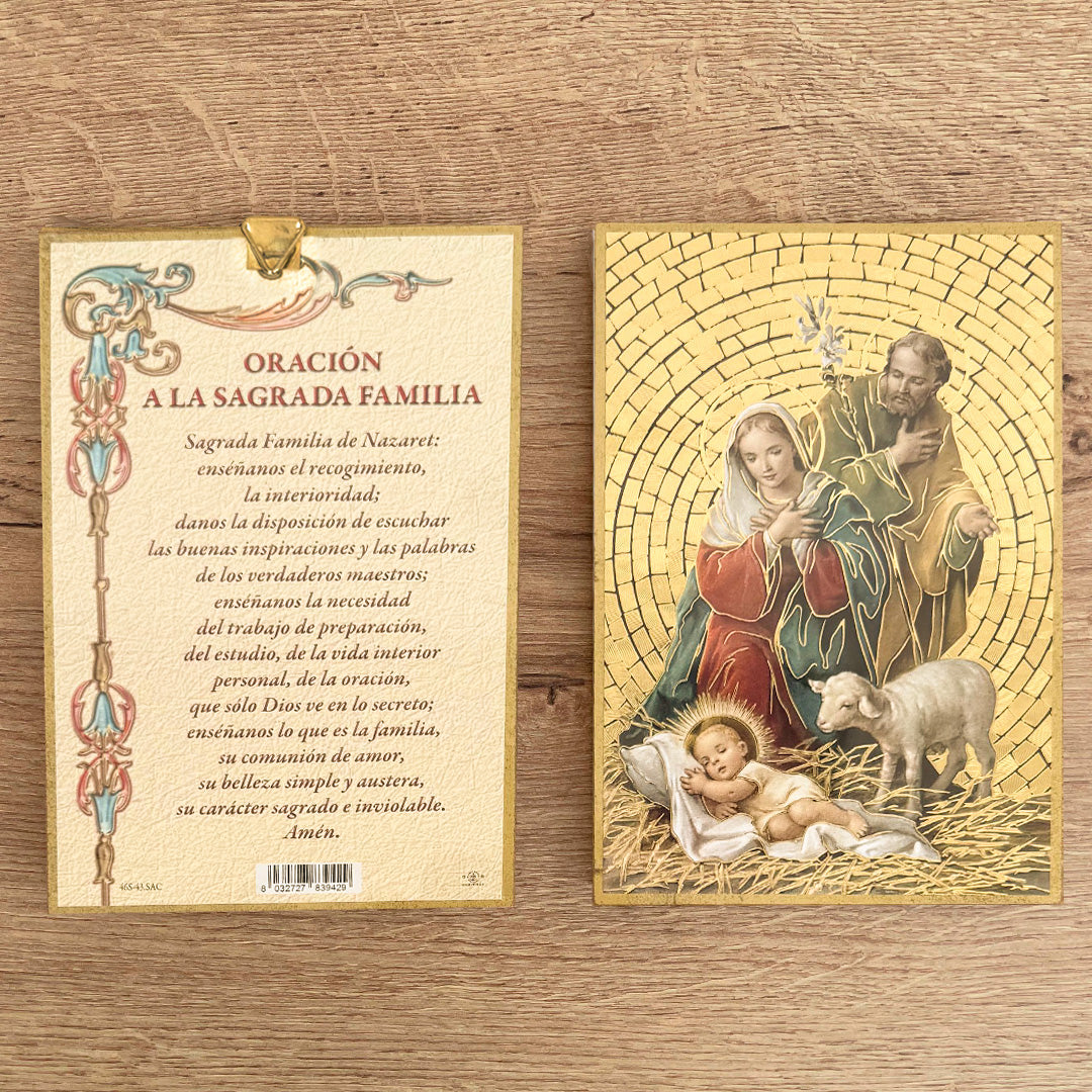 Este encantador retablo de madera, diseñado para colgar en la pared, captura la serenidad y el amor de la Sagrada Familia en el pesebre. En el frente, se presenta una delicada imagen de María, José y el Niño Jesús en la escena del nacimiento, irradiando paz y unión. En la parte posterior, se encuentra la Oración a la Sagrada Familia, una plegaria especial para fortalecer los lazos familiares y llenarlos de bendiciones.