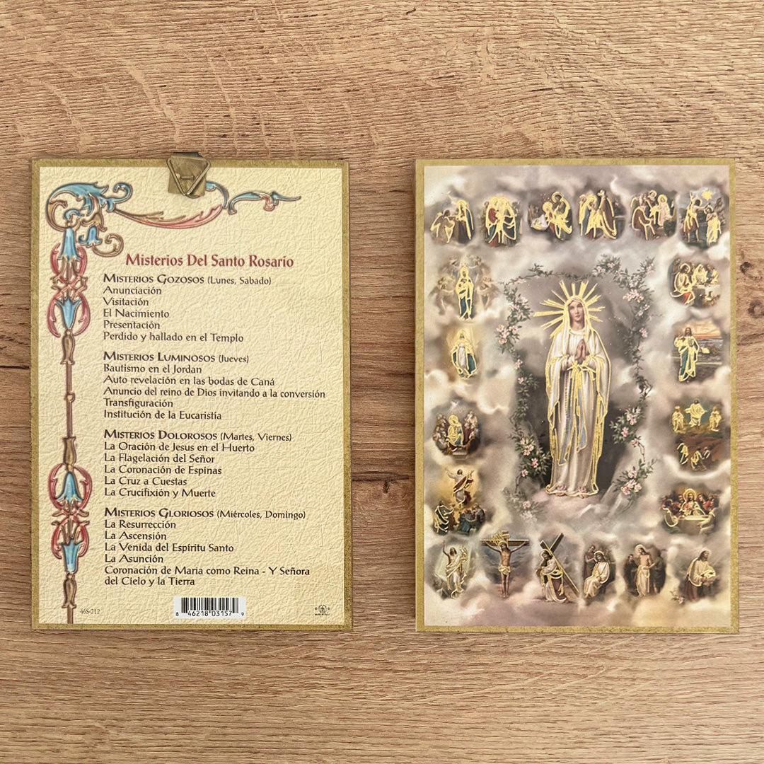 Este hermoso retablo captura la esencia espiritual del Santo Rosario, presentando en el frente la imagen de la Virgen rodeada por pequeñas representaciones de las escenas de los misterios gozosos, dolorosos, gloriosos y luminosos. En la parte posterior, encontrarás una guía práctica con los misterios del Rosario organizados según el día, facilitando tu devoción diaria.