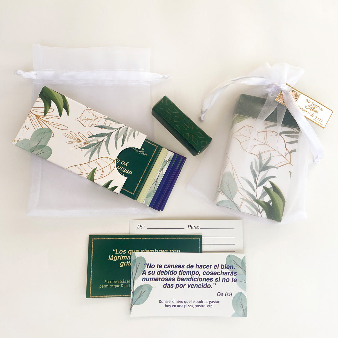 Uso: El Kit 40 Promesas es ideal para fortalecer tu fe y confianza en Dios diariamente. Cada tarjeta ofrece una promesa divina acompañada de una actividad práctica, proporcionando una manera tangible de reflexionar y actuar sobre las palabras sagradas. Además, el espacio en la parte posterior de cada tarjeta permite personalizar los mensajes, lo que hace de este kit un regalo significativo y espiritual para tus seres queridos.