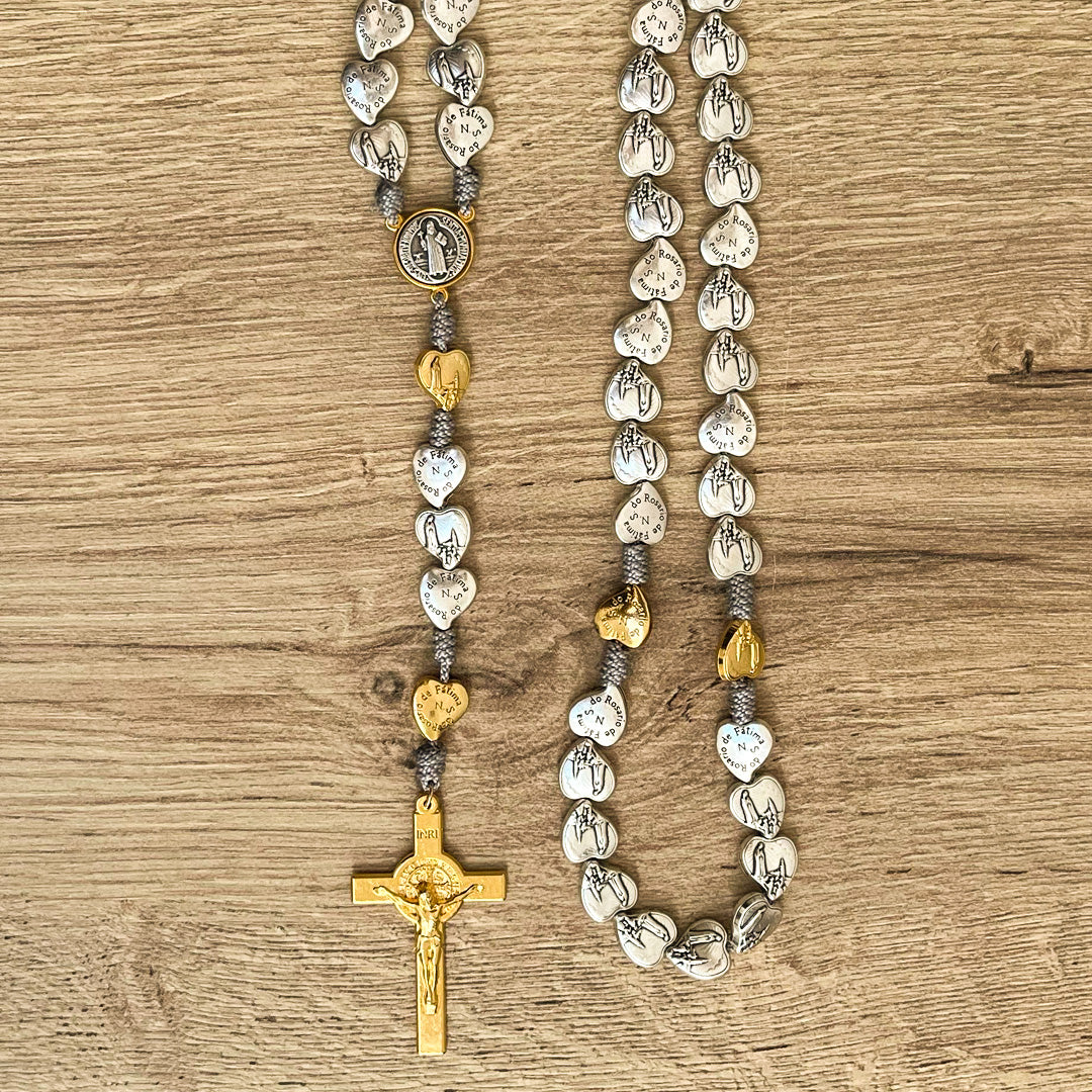 Este rosario artesanal combina fe y elegancia con su diseño en hilo gris y medallas en forma de corazón de la Virgen de Fátima. Cada cuenta de 1.3 cm x 1.2 cm está hecha de zamak, mientras que las cuentas que marcan los misterios tienen un refinado baño en oro. El crucero presenta una medalla de la Virgen Milagrosa con baño en oro (1.5 cm de diámetro), y el rosario se completa con un Cristo de San Benito de 5 cm x 3 cm. Su longitud total es de 52 cm.