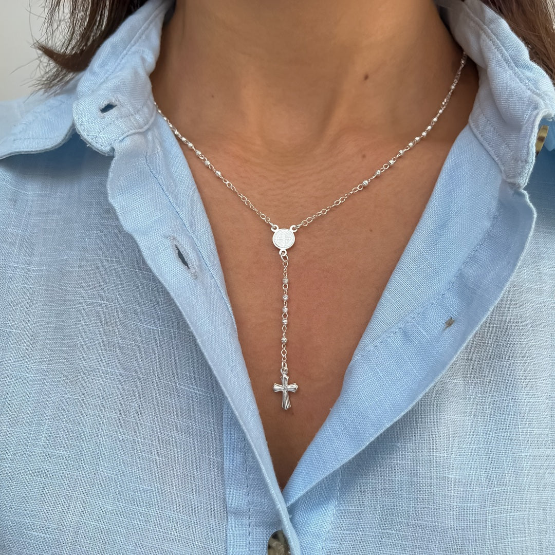 En el centro se encuentra un crucero de San Benito de 8 mm de diámetro, símbolo de defensa espiritual y fe inquebrantable. Al final, una cruz de 1.2 cm x 9 mm completa esta pieza, equilibrando sobriedad y belleza. Su longitud total de 31 cm lo hace ideal para portar contigo o guardar en tu espacio de oración.