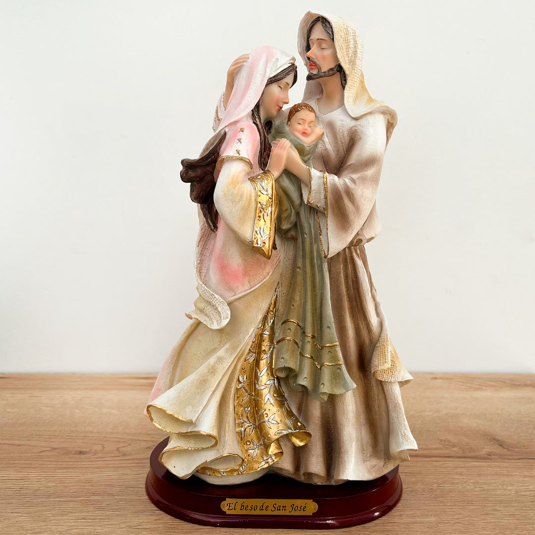 Embellece tu hogar con la conmovedora imagen de la Sagrada Familia Beso, donde José le ofrece un tierno beso a la Virgen María. Esta hermosa representación, meticulosamente elaborada en resina italiana y base de madera, captura la intimidad y el amor entre José, María y el Niño Jesús. Con unas dimensiones de 30 cm de alto x 16 cm de ancho, esta obra de arte es una adición conmovedora a cualquier espacio.