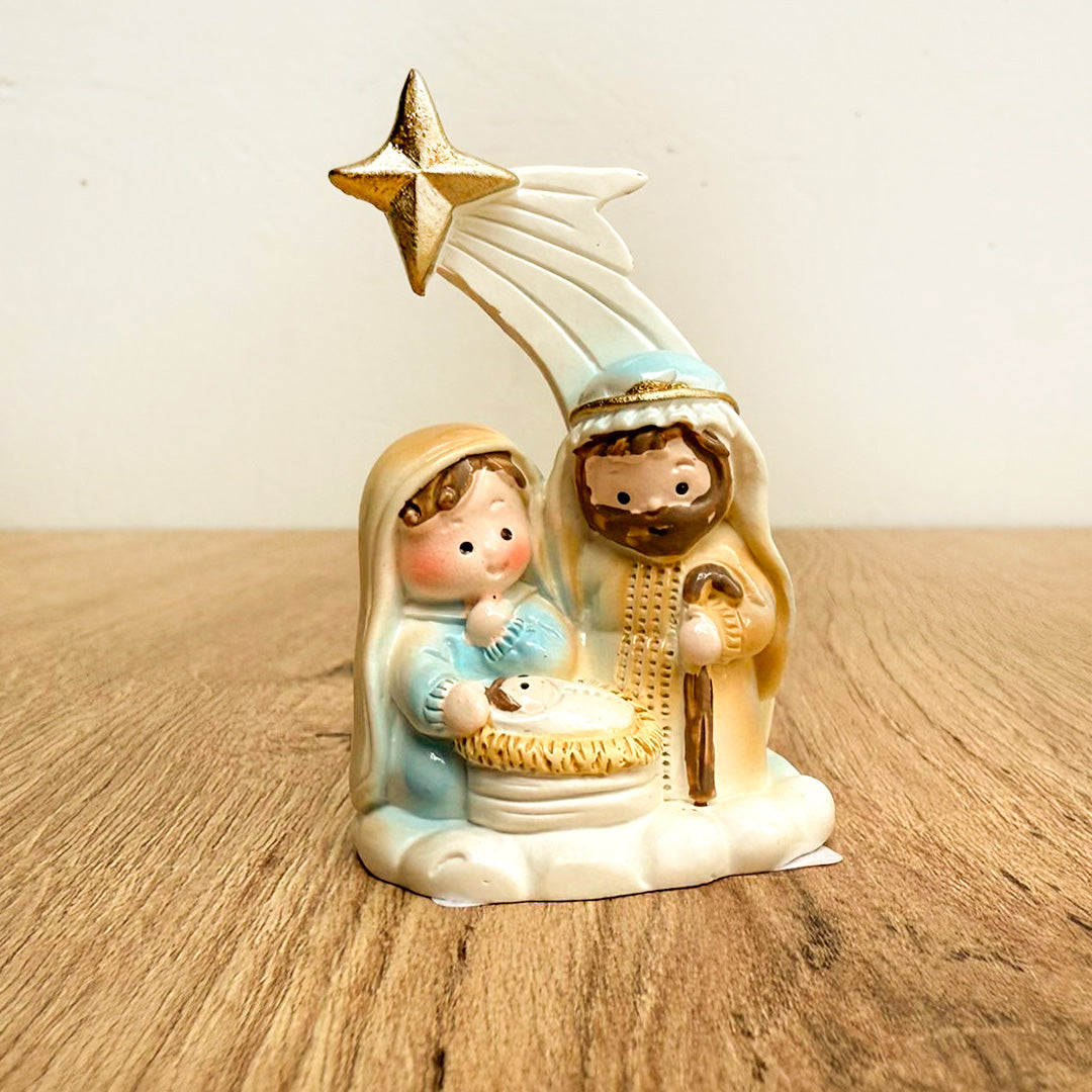 Una dulce escena del Nacimiento bajo una estrella dorada, donde la Virgen María y San José contemplan con ternura al Niño Jesús en su pesebre. Sus tonos suaves y el brillo tipo porcelana evocan paz y pureza, convirtiéndola en una pieza encantadora para decorar o regalar en Navidad.