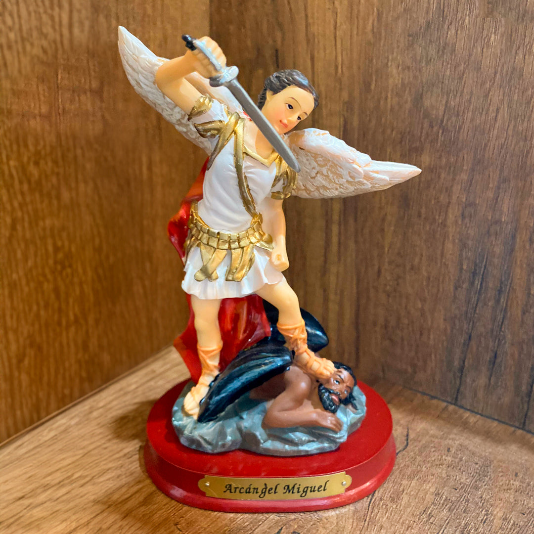 Embellece tu hogar con la presencia protectora del Arcángel San Miguel mediante esta impresionante estatua de 12.5 cm de altura. San Miguel, conocido como el defensor contra las fuerzas malignas y el líder de la corte celestiales, es una figura espiritual que infunde fortaleza y protección en el corazón de los fieles.