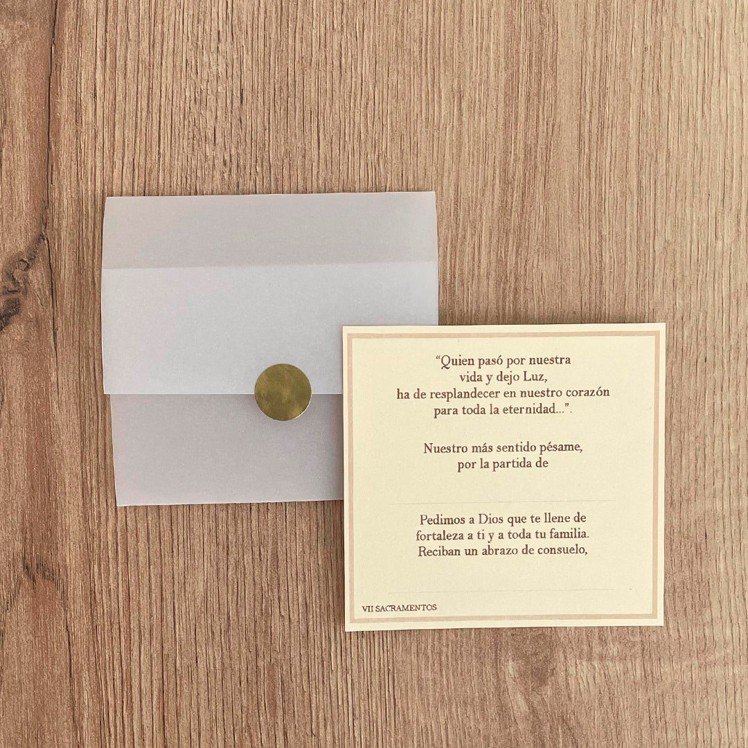 Con su diseño sobrio y elegante, la Tarjeta Sufragio es una manera adecuada y respetuosa de mostrar tu empatía y solidaridad en tiempos de duelo.